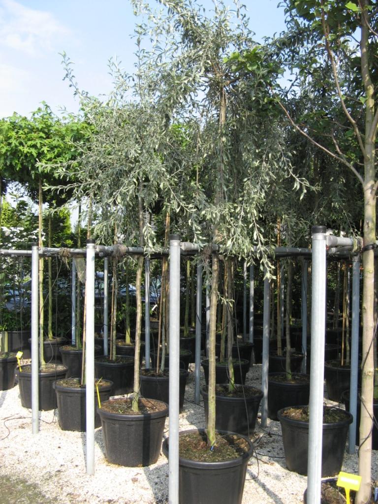 Een grijsbladige peer met afhangende takken.